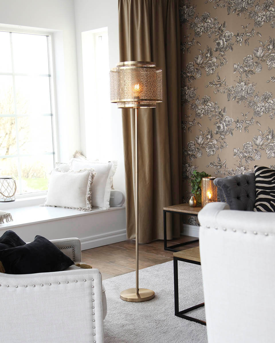 Lampa de podea Hermine oferă casei tale o atmosferă armonioasă și confortabilă. La bază, lampa are o plăcuță din metal alamă mată. De acolo, un tub se extinde în sus, iar în partea de sus se află un cilindru cu un model decupat. Un alt cilindru similar se află deasupra primului. Ambele tuburi au modele decupate cu motive florale. Odată ce această lampă de podea fantastică este aprinsă, oferă o lumină caldă și primitoare.